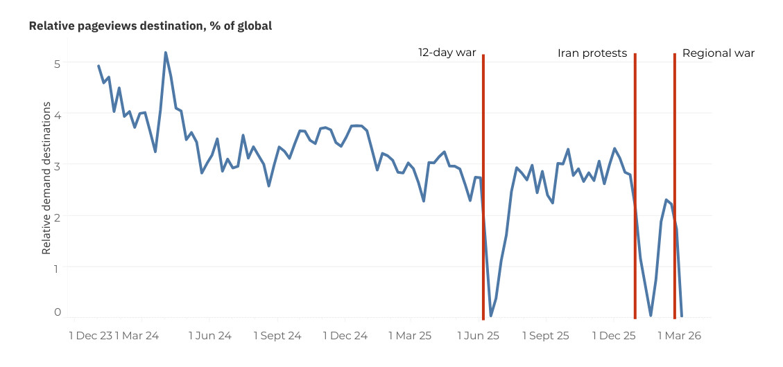 Students in Iran are largely cut off from the internet entirely, so any drop in their search activity reflects that. After the last major internet shutdown during the Twelve-Day War in 2025, student interest for degree programmes on Studyportals returned once internet was restored.